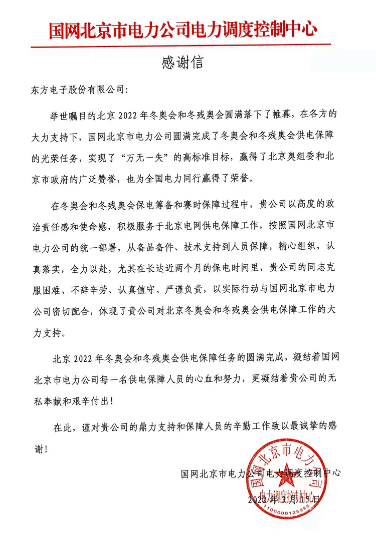 Thank you letter from Winter Olympics! DFE successfully completed the task of guaranteeing power supply during the Winter Olympics and the two sessions.